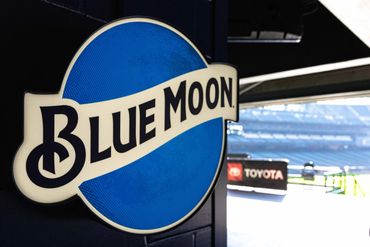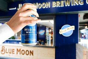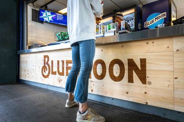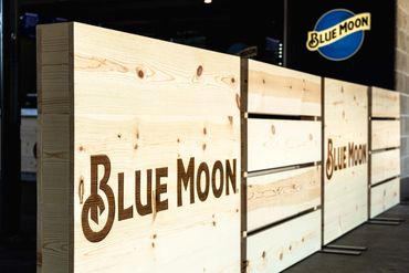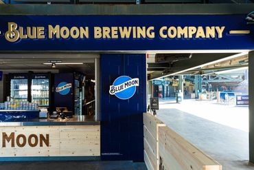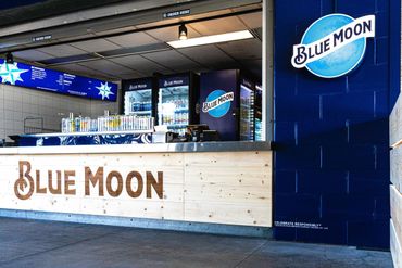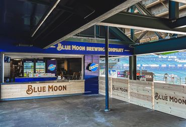 The client (Jack Morton) produced renderings to highlight a Seattle Mariners' Stadium concession stand as a Blue Moon Brewing bar. The new bar featured wood-branded facades, custom-built barricades, lit signage, vinyl-wrapped fridges, and blue wall coverings.